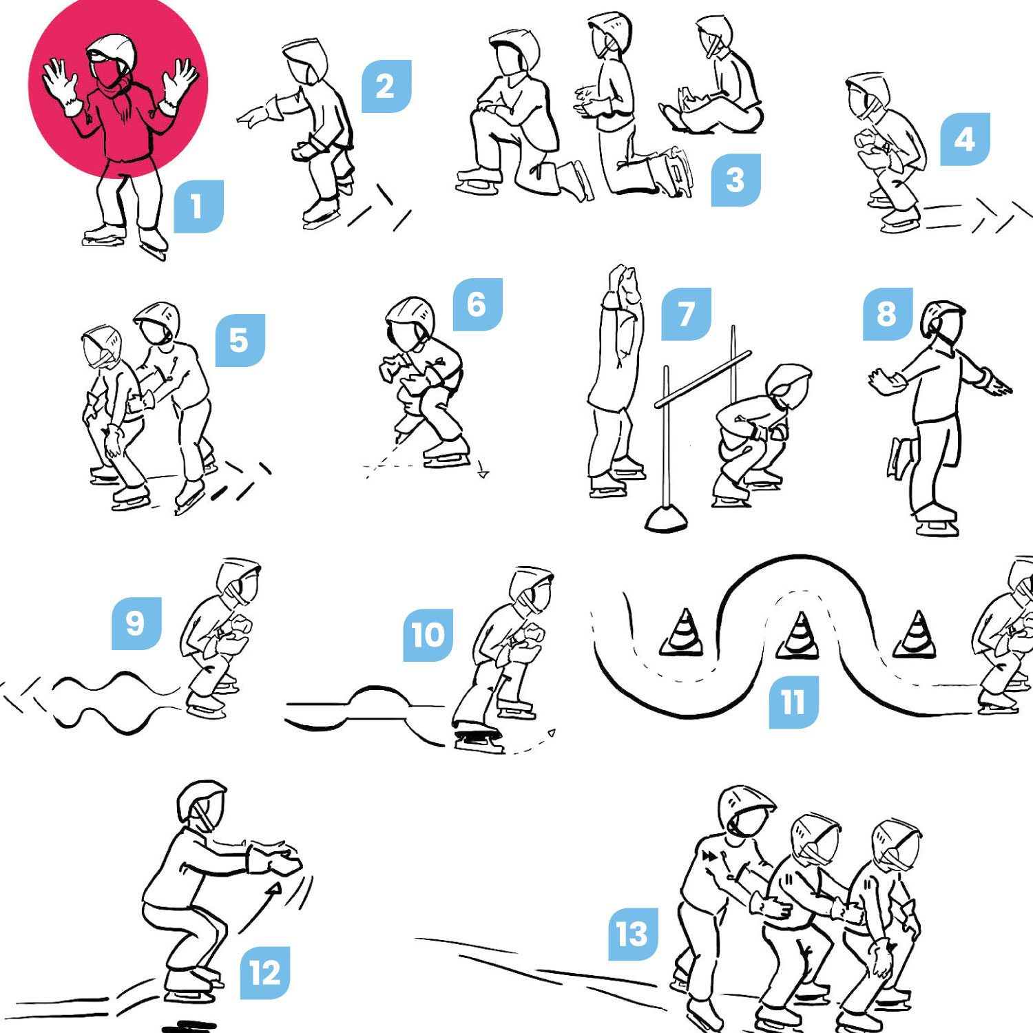 - Entenlauf: Die Kinder machen einige "Watschelschritte" in Grundstellung, dabei wird die Fußstellung beibehalten. Zuerst auf der Gummimatte, dann am Eis.