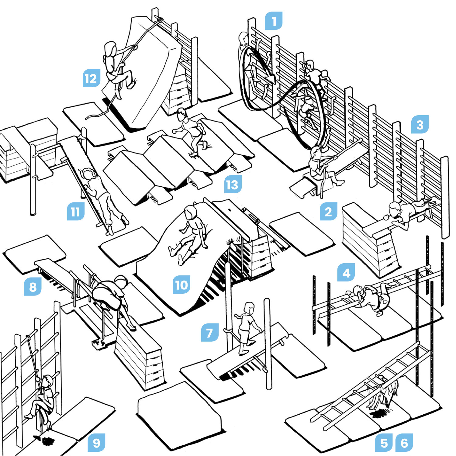 - Klettersteig: Die Kinder erklettern die Schrägwand (den Weichboden), indem sie sich mit den Händen am Tau nach oben ziehen und die Füße gegen den Weichboden stemmen.