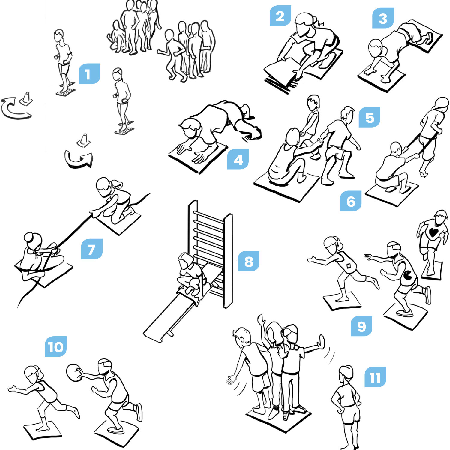 - Flussüberquerung: Die Kinder bewegen sich mit Hilfe von zwei Teppichfliesen vorwärts, indem sie von Fliese zu Fliese springen.