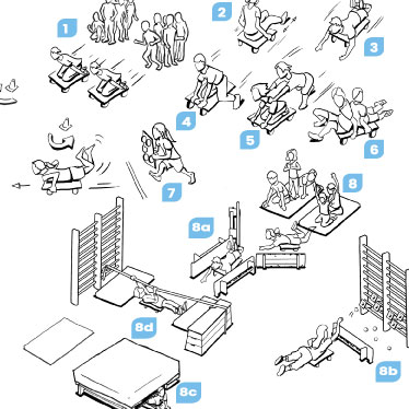 8.a-8.d: Staffel, jede Gruppe hat ein Rollbrett und eine Matte als Start- und Zielpunkt