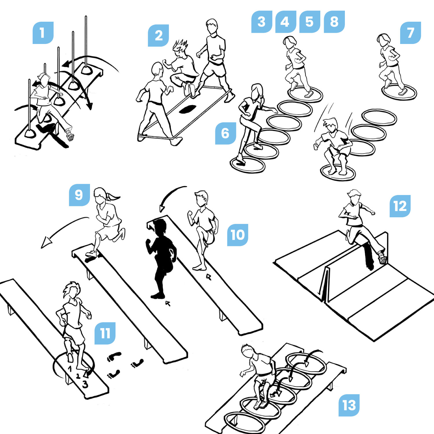 - Turnbanklauf: Mehrere Turnbänke werden im gleichen Abstand quer zur Laufrichtung aufgestellt. Die Kinder überlaufen die Bänke in beliebigem Rhythmus.
