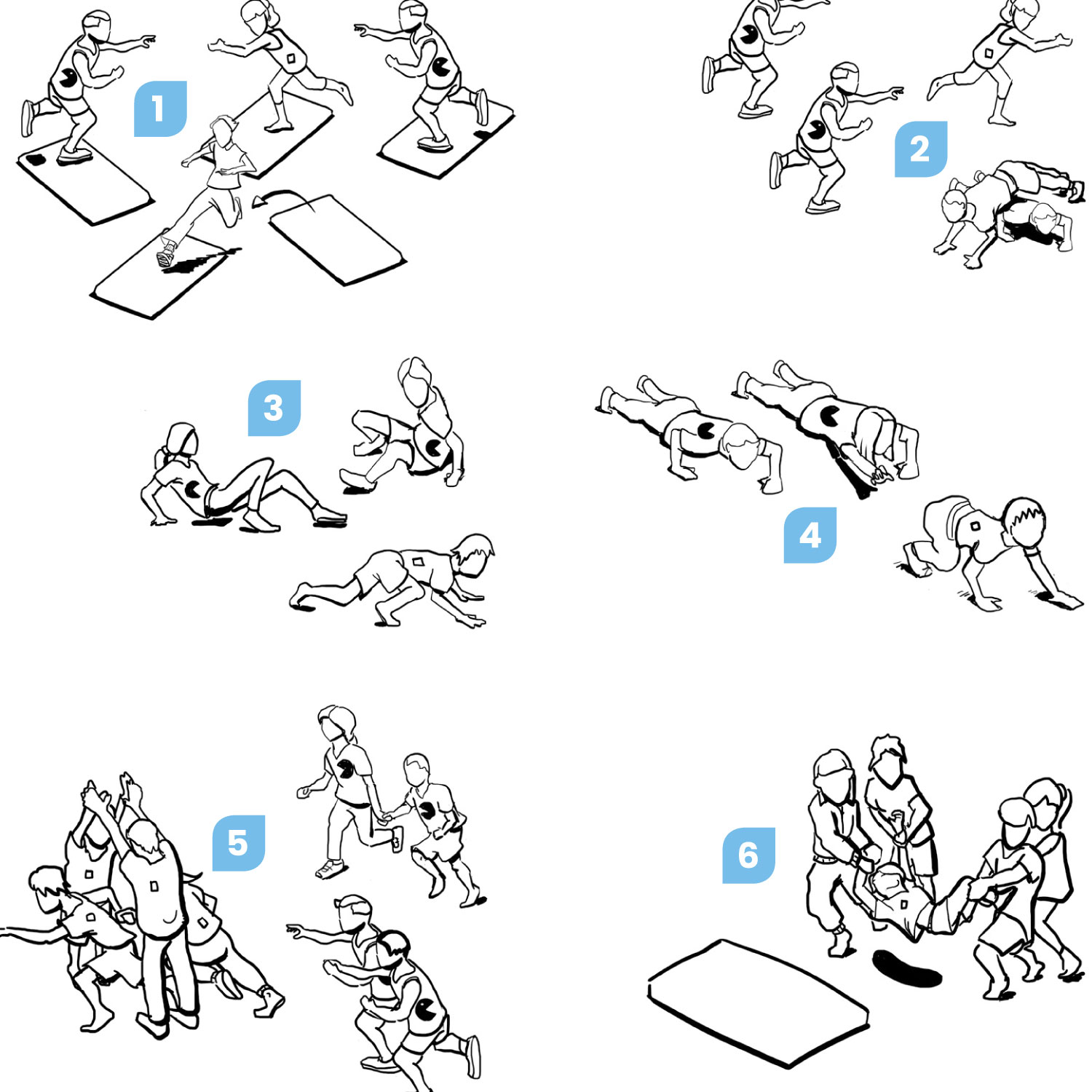 - Versteinern: Zwei oder mehrere Kinder werden durch Schleifen als Fänger/-innen markiert. Wer gefangen wird, ist versteinert und geht in die Liegestützposition. Erlöst wird das Kind, indem ein anderes freies Kind unter ihm durchrutscht.