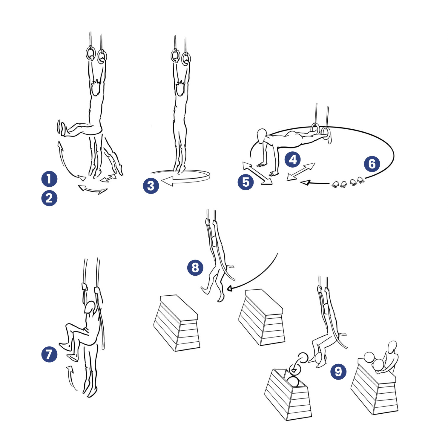 Ringe knapp über dem Boden, Füße im Ring, Matten großräumig auslegen