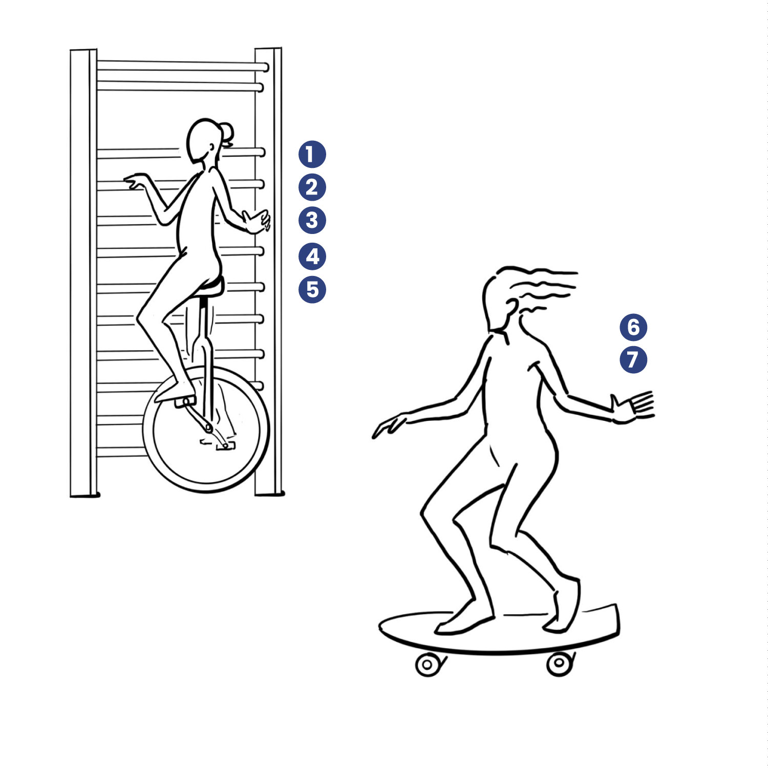 - Entlang der Sprossenwand fahren und mit einer Hand nachgreifen (beidseitig üben)
