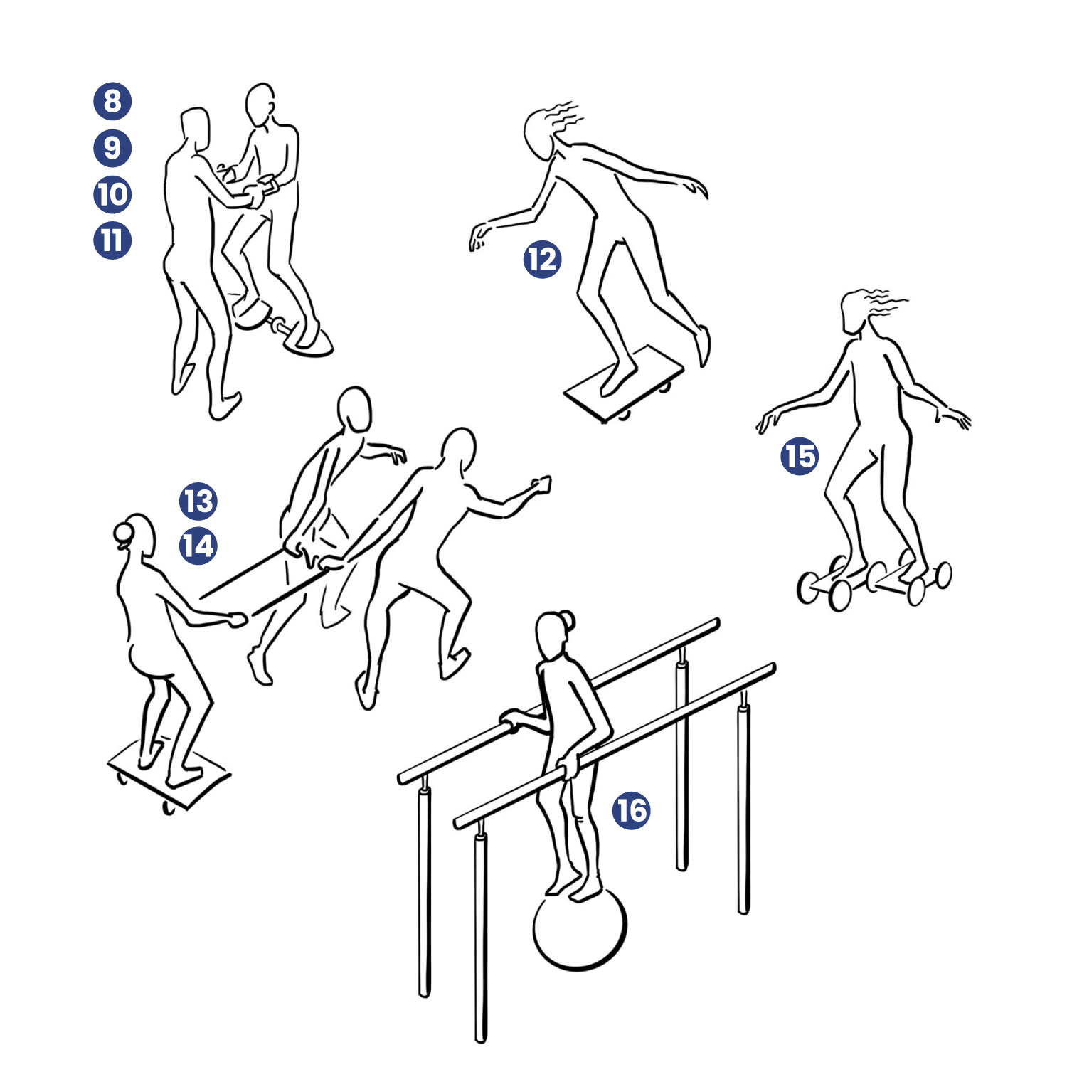 - Paarweise: beidbeiniges Stehen am Wagerl, der Übende wird vom Helfer mittels Sprungschnur gezogen.
