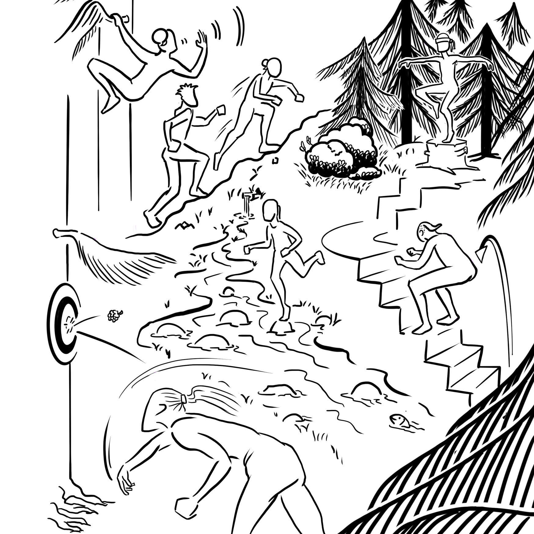 - Stiegen, Gehsteigkanten, kleine Mauern, Baumstümpfe und ähnliches eignen sich für Treppensprünge und Treppenläufe.