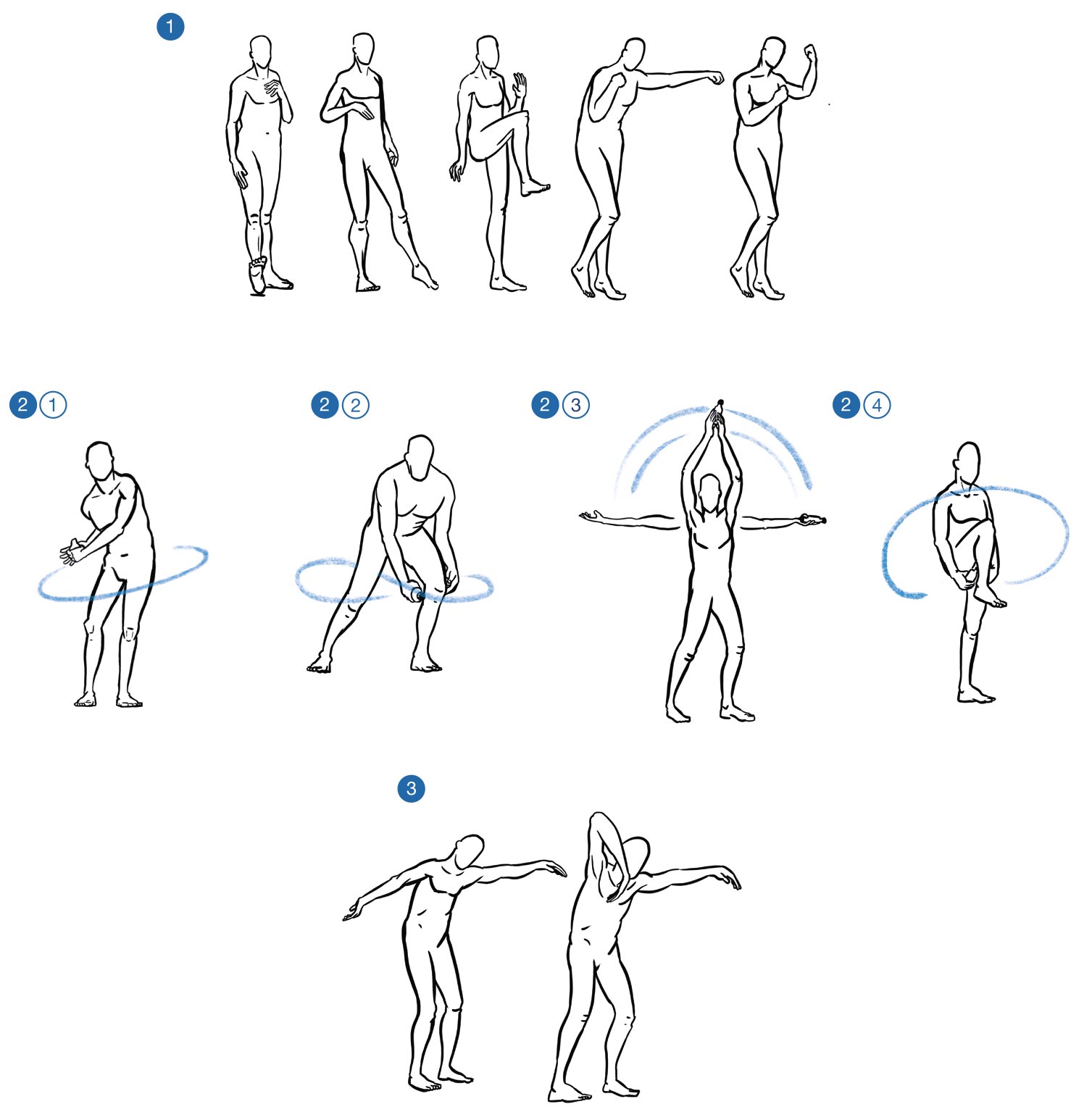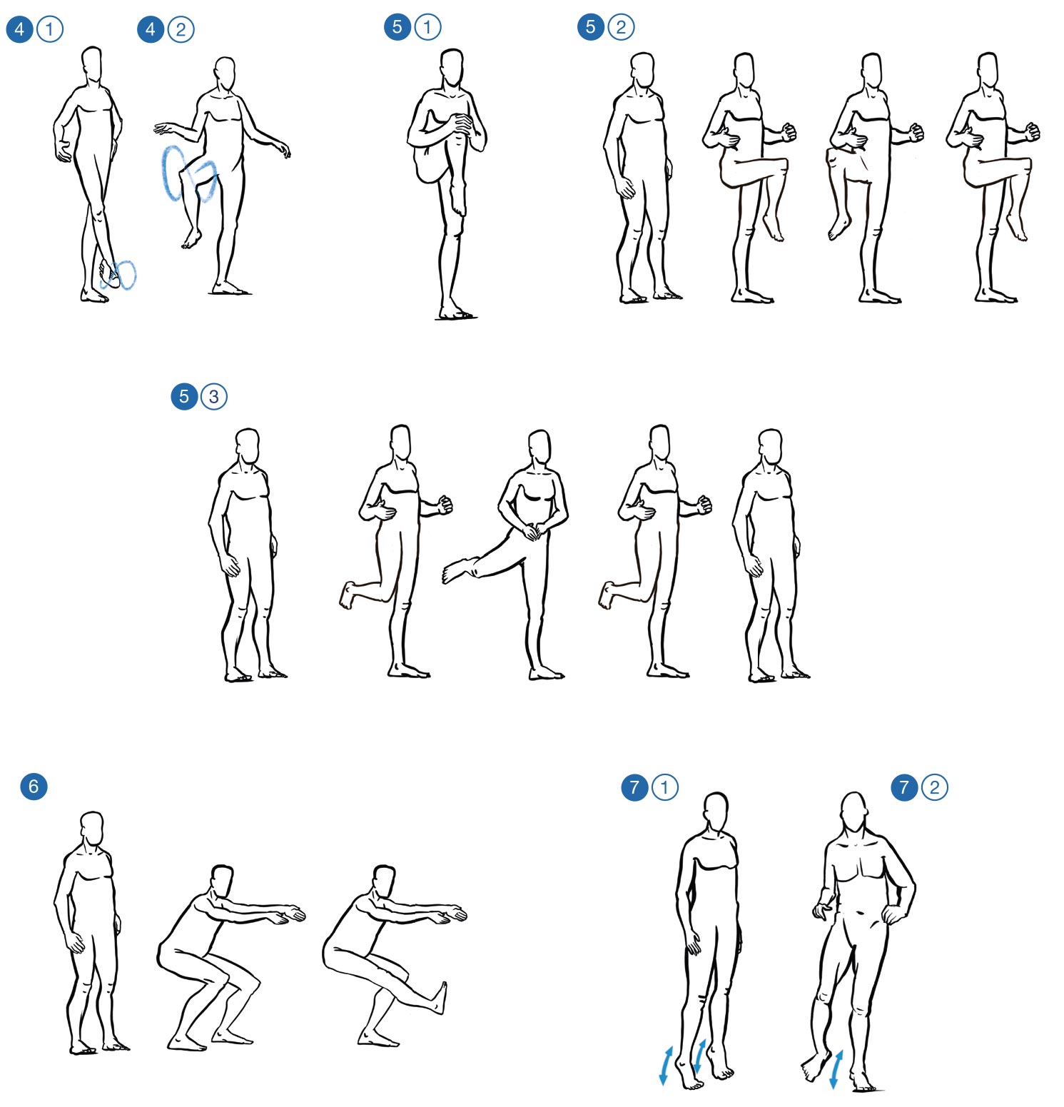 Ausgangsposition: aufrechter schulterbreiter Stand- Einen Fuß gestreckt vom Boden abheben, einen Achter mit den Zehen in die Luft zeichnen, Richtungswechsel, Beinwechsel