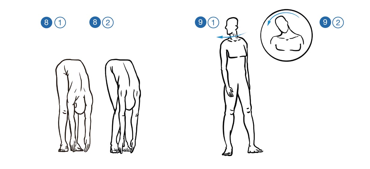 - Im Grätschstand, Oberkörper nach vorne gebeugt, Trinkflasche in einer Achterbewegung um die Oberschenkel kreisen, Oberkörper mitbewegen, Grätsche größer machen, Richtungswechsel