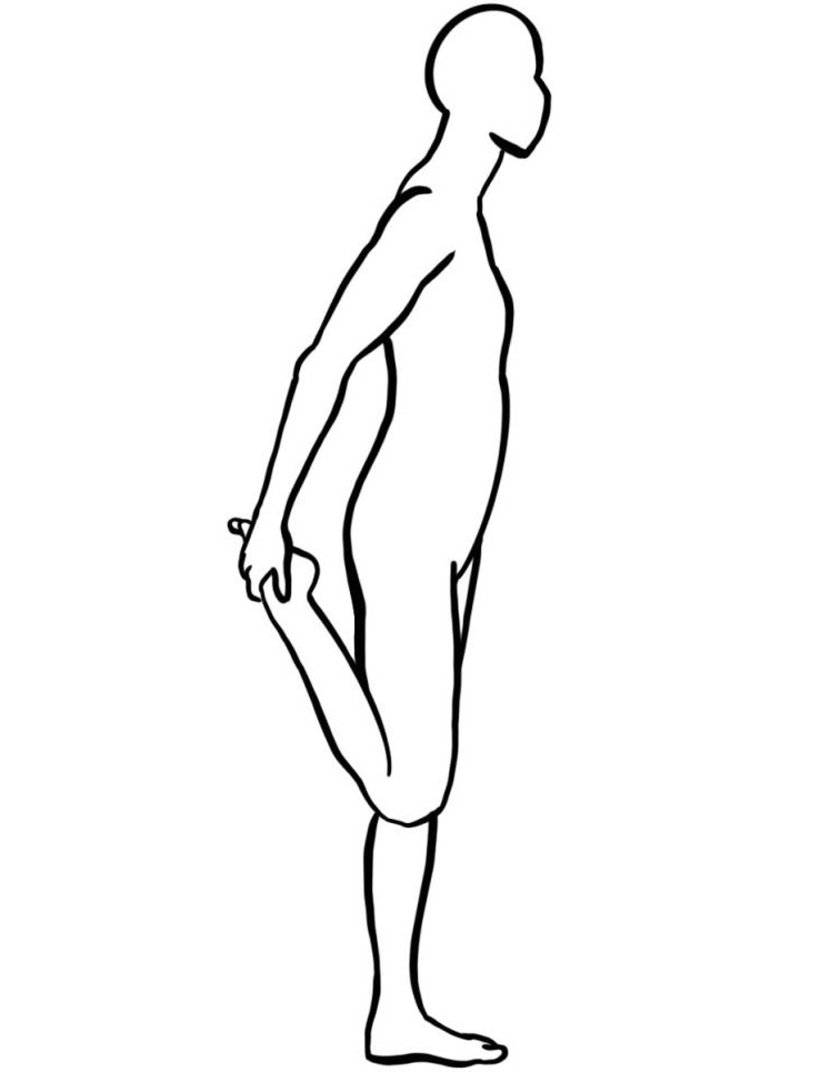 - Aus dem hüftbreiten Stand das rechte Bein abwinkeln, mit der rechten Hand am Sprunggelenk das Bein umfassen und die Ferse zum Gesäß führen. Das Knie des angewinkelten Beines möglichst hinter das Knie des Standbeines ziehen. Die andere Hand stabilisiert. Das Bein nicht verdrehen!