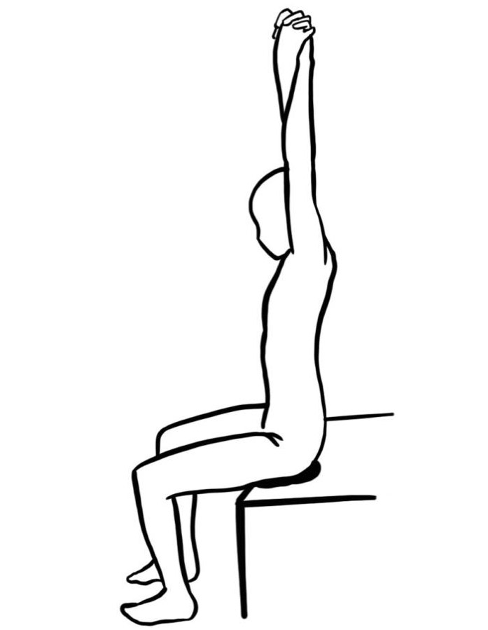 - Sitz auf einem Hocker/Pezziball, die Arme nach vorne strecken, die Arme überkreuzen sich auf Höhe der Handflächen, die Handflächen drehen nach außen und greifen ineinander. Anschließend die Hände mit gestreckten Armen über Kopf bringen.
