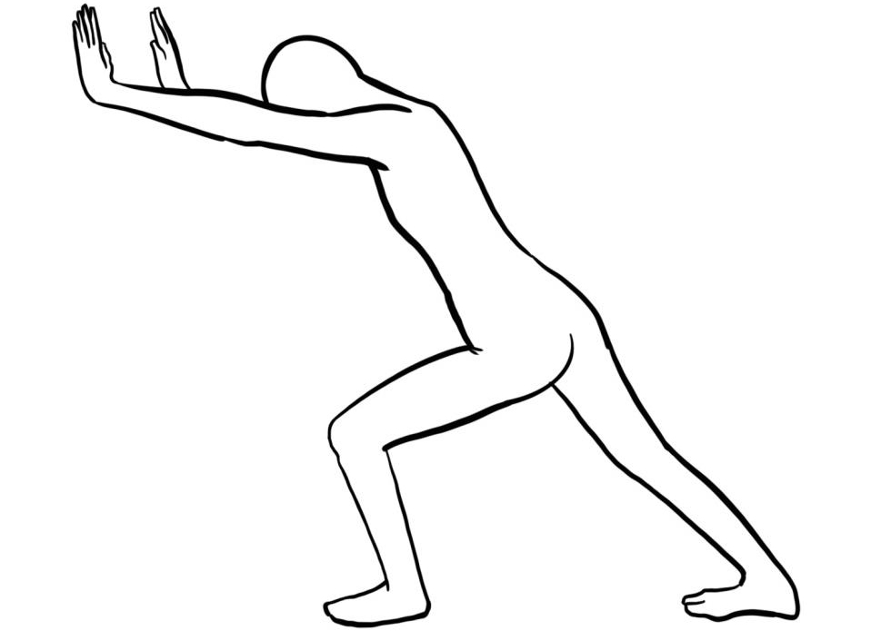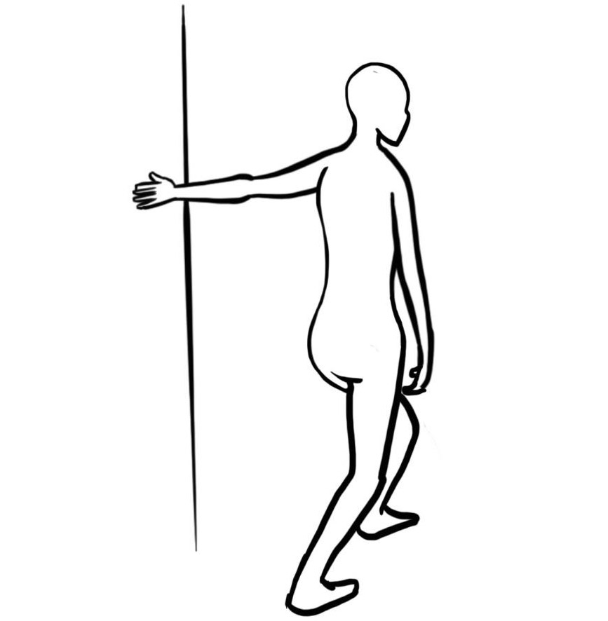 - Aufrechter Stand vor einer Wand; an dieser mit den Händen abstützen; ein Fuß ist weiter hinten, ist belastet, die Ferse bleibt am Boden, das Bein bleibt gestreckt; die Hüfte nach vor drücken.