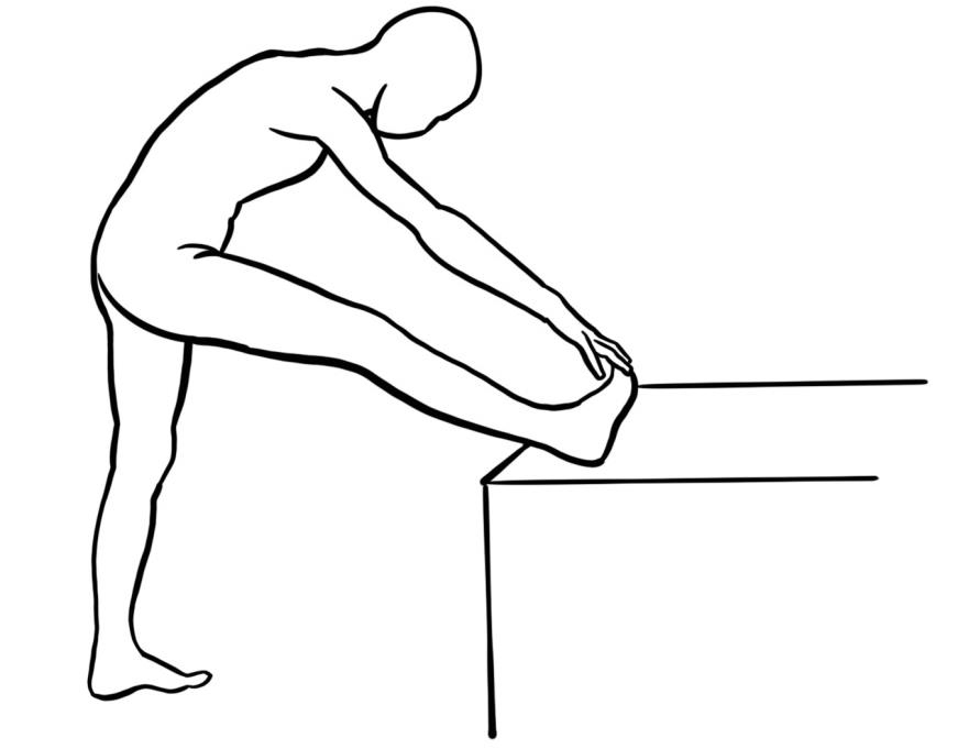 - Am Standbein stehen, das andere Bein ausgestreckt auf Bank, Sessel o.ä. auflegen, die Zehen ziehen Richtung Körper, der Oberkörper beugt leicht nach vorne.