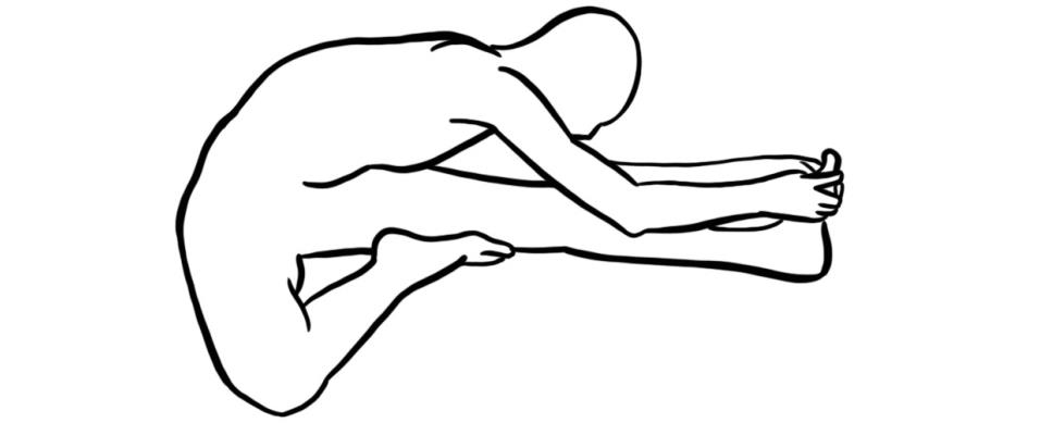 - Langsitz am Boden, anwinkeln eines Beines, seitliches Aufklappen („Fliegen Flügel“), zur Verstärkung des Dehnreizes die Zehen des gestreckten Beines zum Körper ziehen, den Oberkörper über das gestreckte Bein legen und nach vorne zu den Zehenspitzen greifen/den Fuß umfassen.
