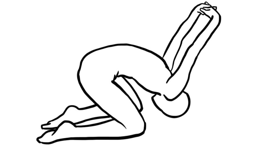 - Aus dem Kniestand die Hände hinter dem Rücken verschränken, die Arme strecken, den Oberkörper nach vorne beugen und mit dem Kopf am Boden abstützen (Gymnastikmatte!). Die Arme gestreckt nach hinten/oben führen.