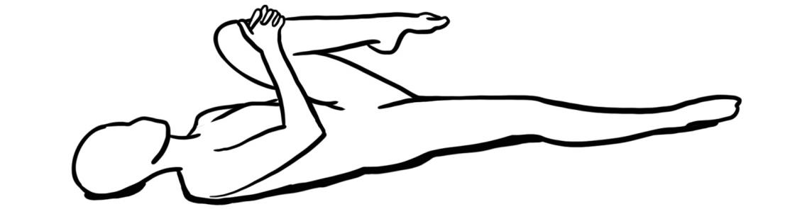 - Rückenlage; das angewinkelte Bein unterhalb des Kniegelenks mit beiden Händen umfassen und das Bein so weit wie möglich zur Brust ziehen. Das andere Bein bleibt gestreckt am Boden. Kein Hohlkreuz! Den Kopf nicht vom Boden anheben!