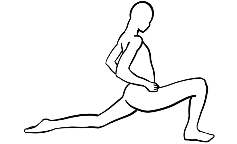 - Einbeiniger Kniestand; das vordere Bein etwas nach vorne schieben und anschließend die Hüfte sanft nach vor drücken, bis der Dehnungsreiz im Oberschenkel des knienden Beines deutlich zu spüren ist. Kein Hohlkreuz! Kein seitliches Ausweichen mit dem Oberkörper! Mit den Händen an der Hüfte stabilisieren.