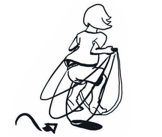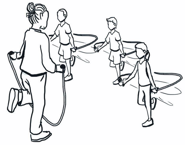 - Im Wechsel 2x mit dem rechten Bein, 2x mit dem linken Bein über das schwingende Seil springen