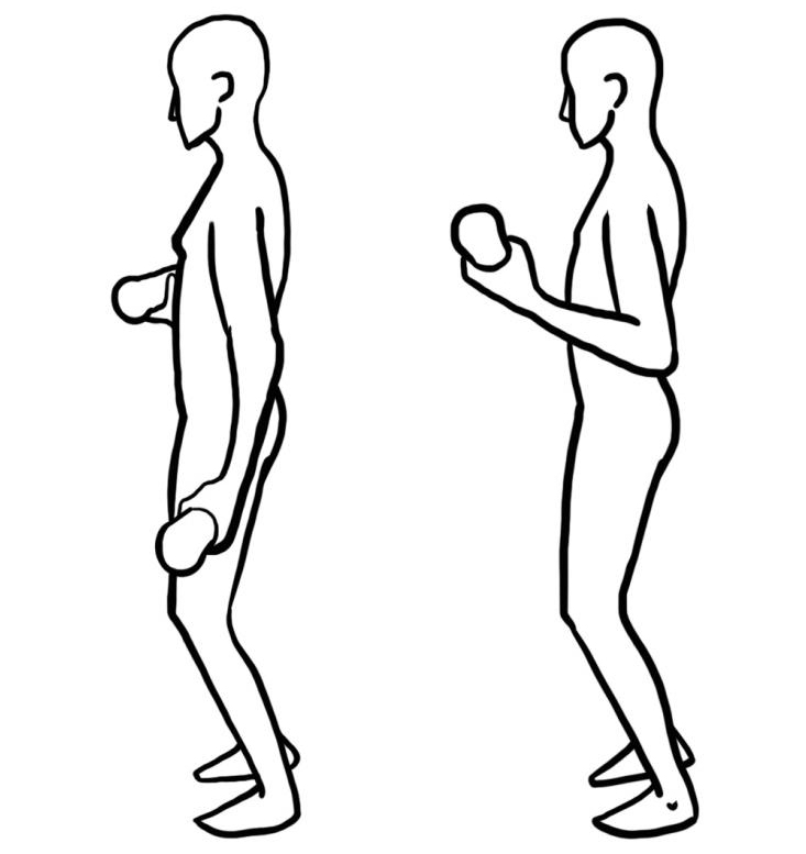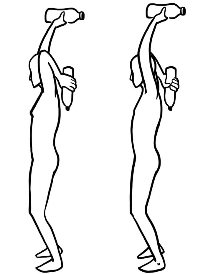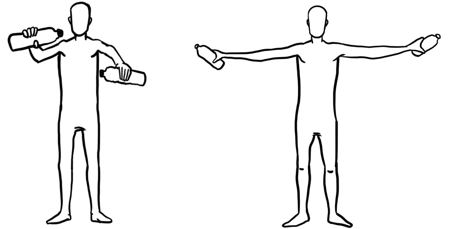 - Ausgangsposition: in jeder Hand eine PET-Flasche, aufrechter Stand, Beine leicht gebeugt; die Handflächen sind bei hängenden Armen nach außen gedreht (Supination); die Ellenbogen sind seitlich stabilisiert