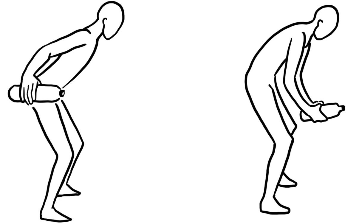 - Ausgangsposition: in jeder Hand eine PET-Flasche; breiter, beidbeiniger Stand; Oberkörper nach vorne gebeugt; die Arme leicht abgewinkelt