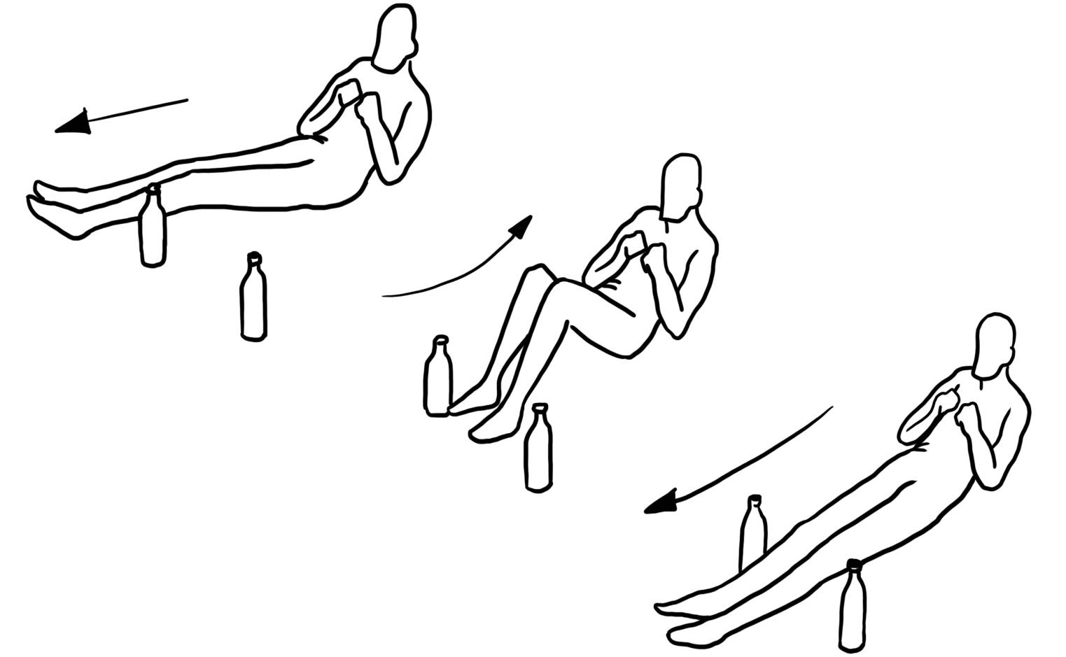 - Ausgangsposition: Sitz am Boden; die Hände berühren den Boden nicht, d.h. kein Abstützen! Die Flaschen stehen im Abstand von ca. einem Meter zueinander, etwa auf Höhe der eigenen Sprunggelenke; auch die Füße berühren während der Übungsausführung nicht den Boden