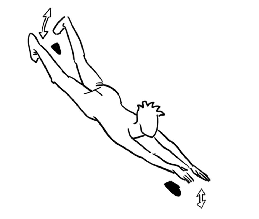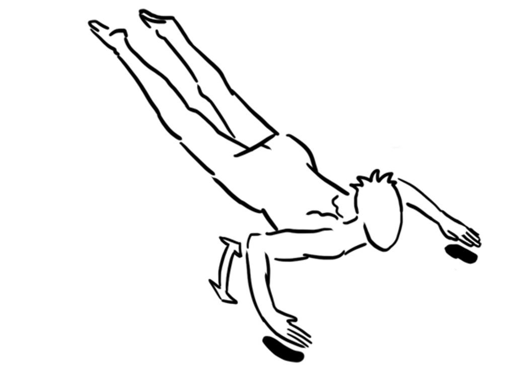 - Arme parallel zum Boden mit Handflächen nach unten gestreckt halten, Scheibenwischerbewegung zur Seite und wieder nach vorne, gleichzeitig Kraulbeinbewegung