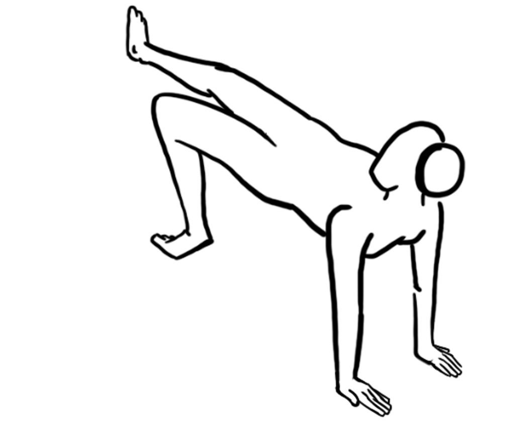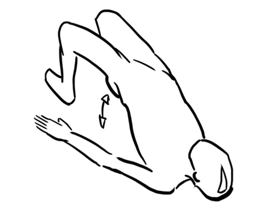 - Bauch zeigt nach oben, die Arme sind nahezu gestreckt, Finder zeigen nach hinten, Beine sind im Knie angewinkelt, Hüfte weitgehend gestreckt, aus der Brücke wechselweise beinheben