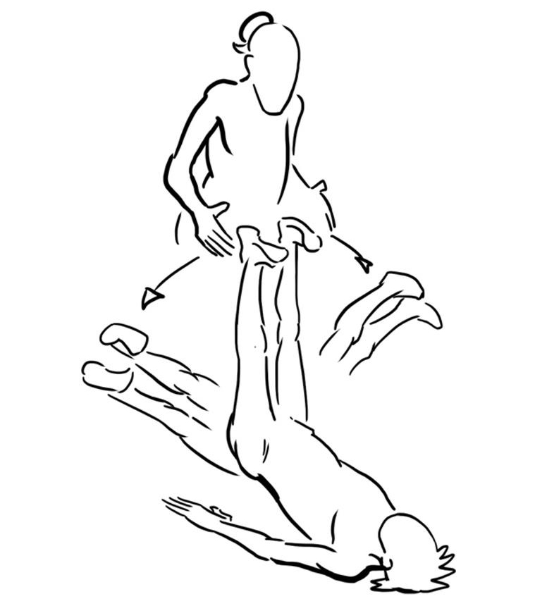 - Partnerübung: Übender in Rückenlage mit zur Decke gestreckten Beinen, Partner versucht durch Druck links oder rechts gegen die Beine zu destabilisieren.