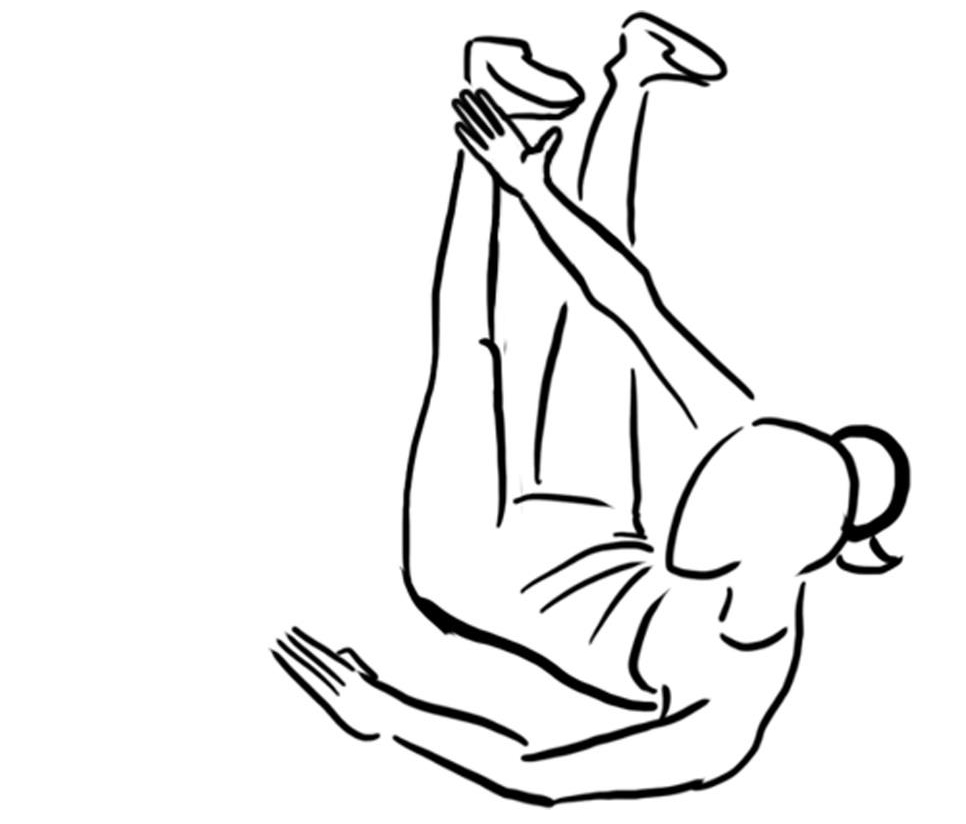 - In Rückenlage mit zur Decke gestreckten Armen und Beinen einen Handrücken am gegenüberliegenden Fuß vorbei Richtung Decke ziehen, im Wechsel