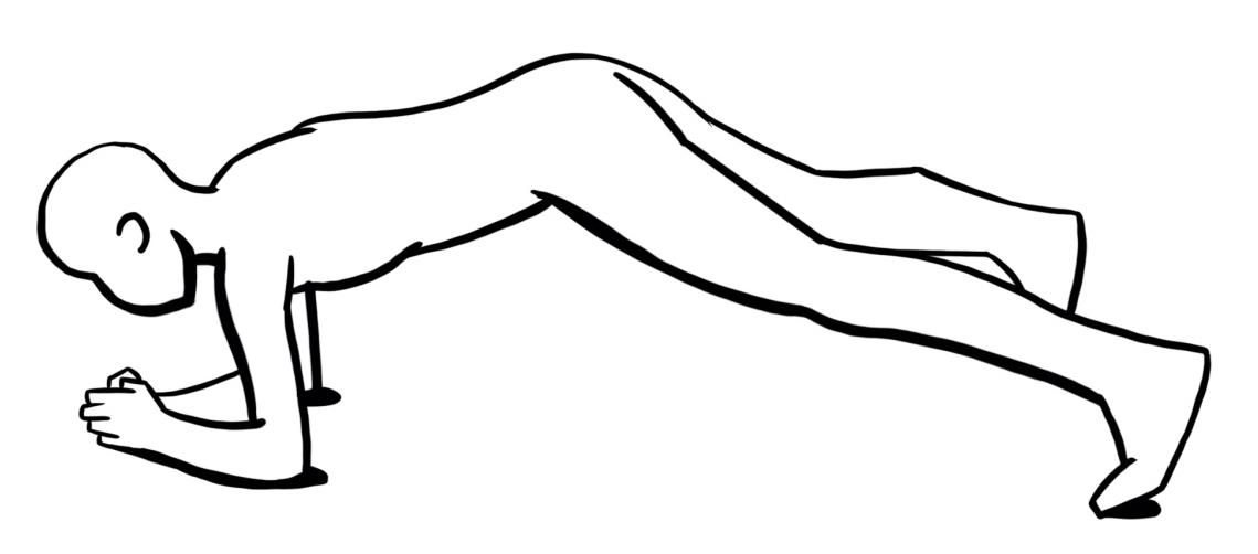 - Ausgangsposition: Unterarmstütz mit geschlossenen gestreckten Beinen, Armhaltung im Dreieck vor dem Gesicht