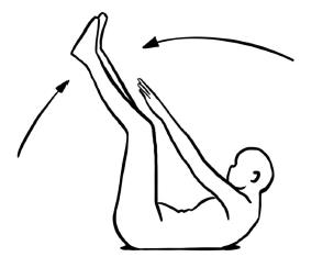 - Oberkörper und die Beine gleichzeitig nach oben ziehen, die Ellbogen sind angewinkelt in Verlängerung der Schulterachse, kurz halten und wieder absenken