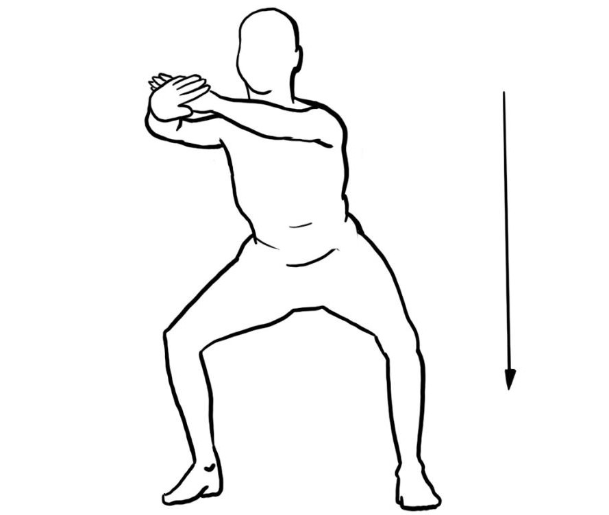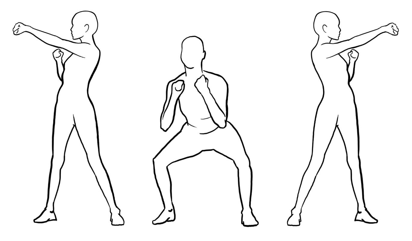 - Aus der Kniebeugeposition aufstehen und den Arm mit geballter Faust wechselweise nach links und rechts strecken