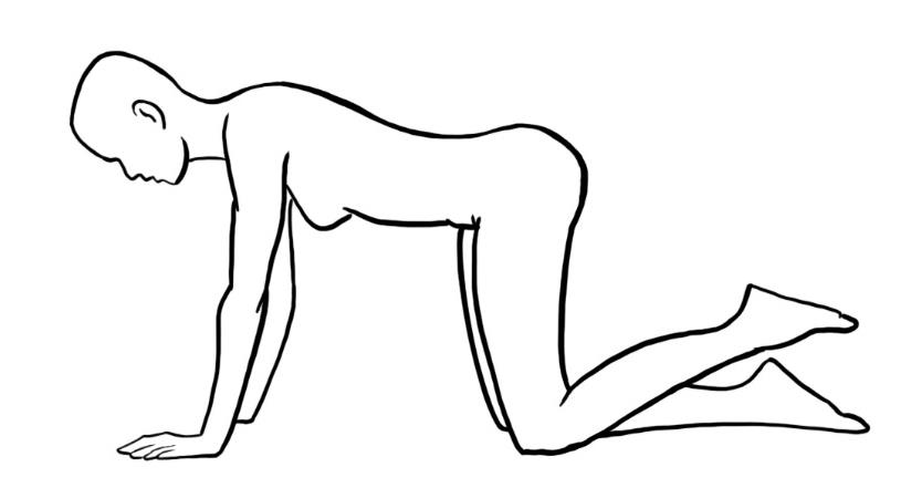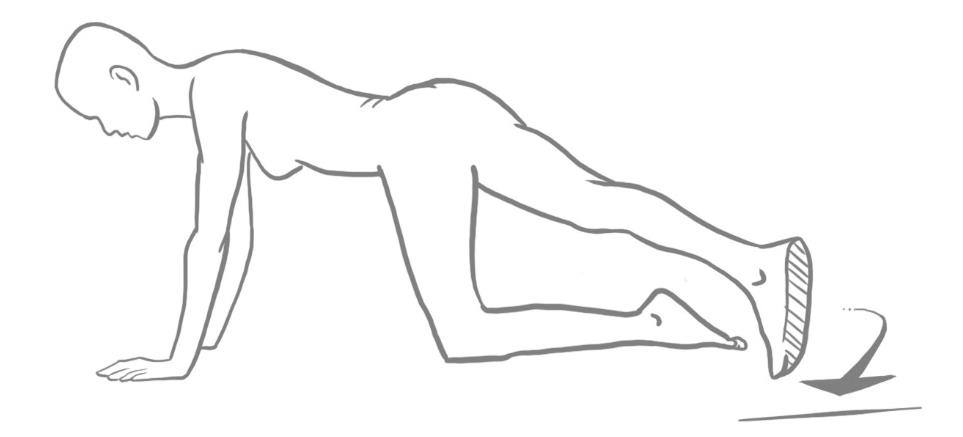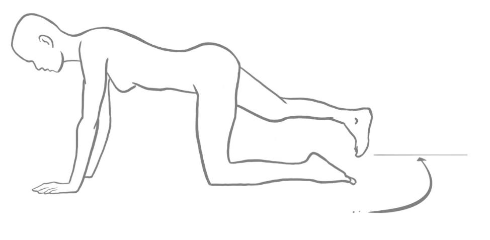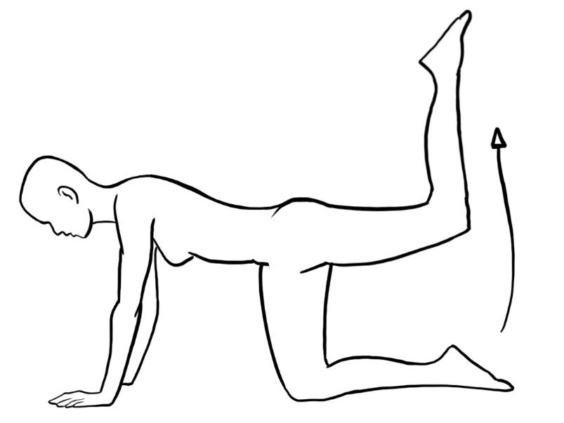 - Aus dem Kniestand mit abgestützten Armen und geradem Rücken die Beine wechselweise anheben, bis der Oberschenkel waagrecht ist, Kniewinkel ca. 90 Grad