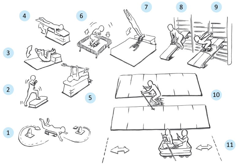 - Skispringer: Wie Rodelübung, jedoch in Skispringerabfahrtsposition stehend auf zwei Teppichfliesen mit Absprung am Bankende Variation: zwei Langbänke nebeneinander mit je einer Teppichfliese