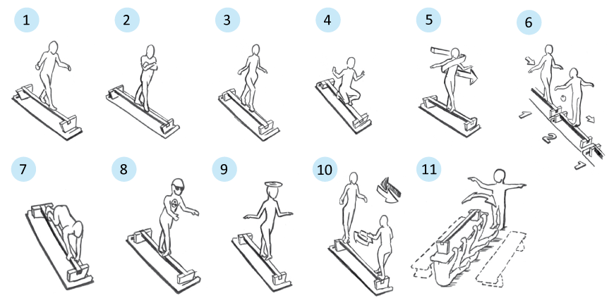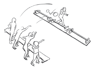Ziel der balancierenden Mannschaft ist es, dass möglichst viele Schüler/-innen ohne Bodenkontakt und ohne stehen zu bleiben, die umgedrehte Langbankreihe überqueren. Die gegnerische Mannschaft versucht mittels Ballwurf die Balancierenden daran zu hindern. Dabei darf jede/r Spieler/-in der Wurfmannschaft seinen/ihren Ball pro Balancierendem/r nur einmal werfen.