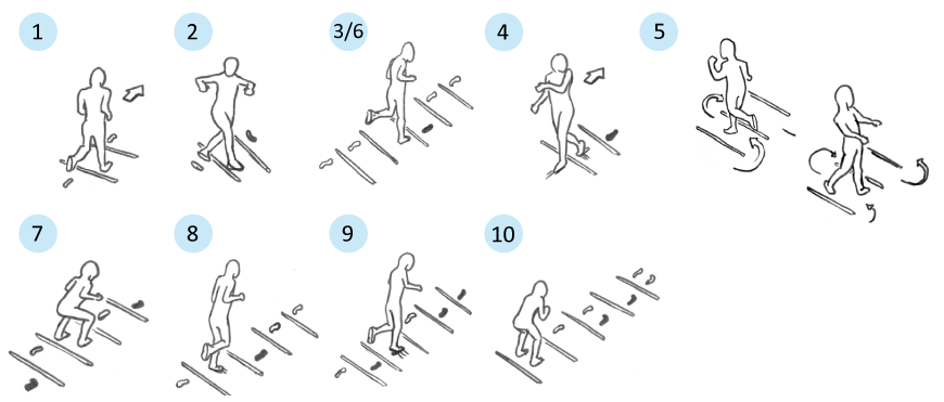 Je 7-10 Sprungschnüre werden quer zur Bewegungsrichtung im Abstand von ca. 80 cm aufgelegt
