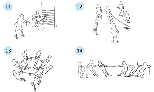 - Seilziehen: Im Langsitz mit Händen am Rücken starten, auf Kommando Seil fassen und stehend ziehen (Achtung: keine Hand- umwickelung und plötzliches Auslassen einer Mannschaft!