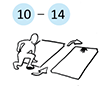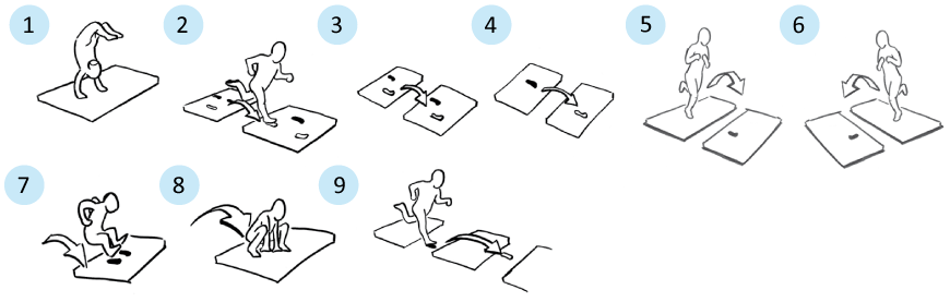 Paarweise über die Matten laufen, zwei Mattenbahnen mit je 5-8 Matten, Abstand zwischen den Matten je 1/2 Meter, 1-3 Wiederholungen pro Übung