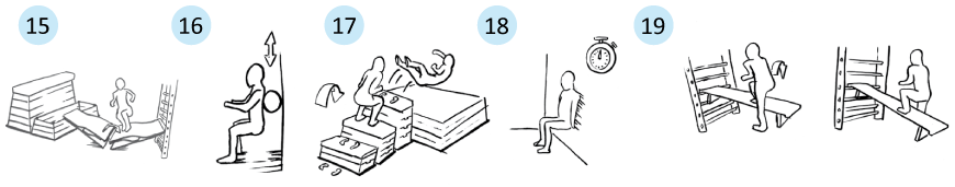 - Beidbeiniges Springen auf die Kastentreppe, vom höchsten Kasten „Sturz“ auf den Weichboden
