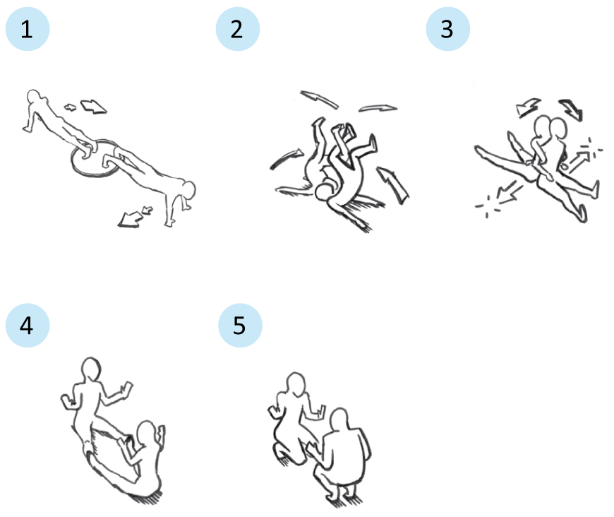 - Kampf um die Hockstellung: Partner/-innen stehen sich in Hockstellung gegenüber und versuchen sich gegenseitig umzustoßen.