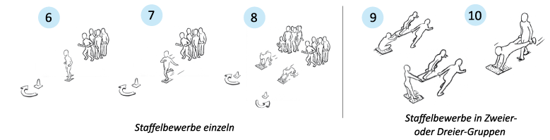 - Stand mit einem Bein auf einer Teppichfliese, abstoßen mit anderem BeinStaffelbewerbe