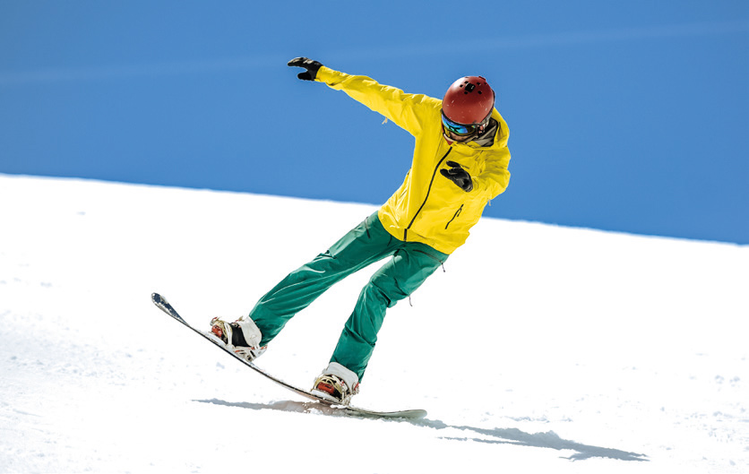 Full Base in der Falllinie, beidbeinig: Das Board liegt auf dem Belag auf (kein Aufkanten). Mit beiden Beinen in der Bindung, Körperlast gleichmäßig auf beide Beine verteilen, dabei vorderes Bein etwas stärker belasten, Körperspannung nutzen, Basic Position beibehalten.