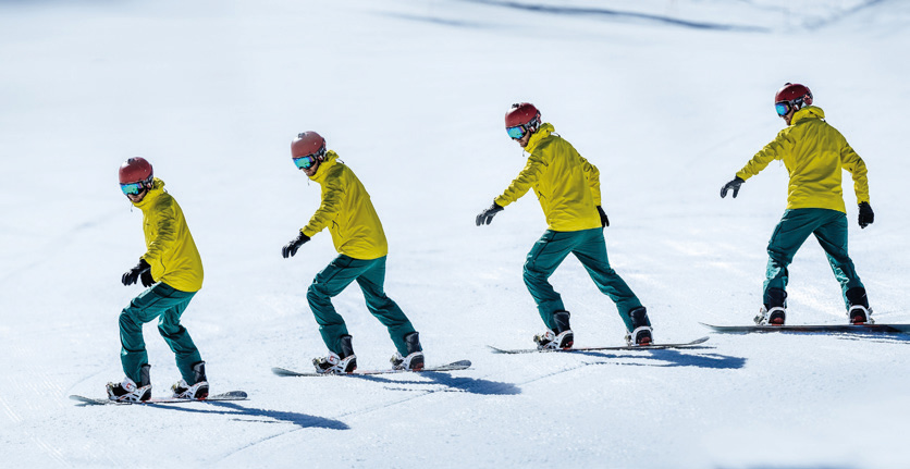 Basic Position, eine talwärts drehend ausgeführte Hochentlastung (Strecken der Beine, Abstoß) und eine gleichzeitige Gewichtsverlagerung nach vorne lassen das Board rasch in Richtung Falllinie drehen – umkanten – nachfolgendes Beugen der Beine und erneutes Aufkanten des Boards sowie das verstärkte hangausgleichende Verhalten steuern den Schwung aus.