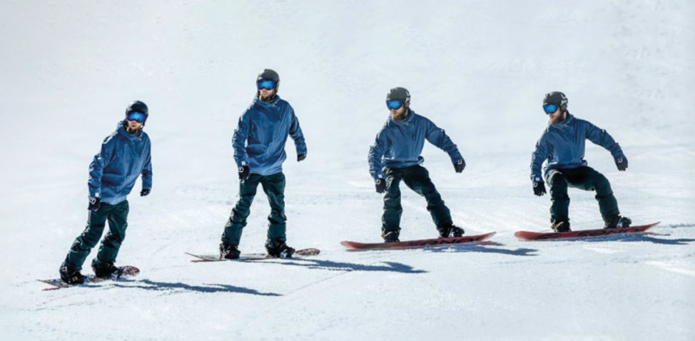 Basic Position, Gewichtsverlagerung Richtung Nose und Torsion des Boards (Verringerung des Aufkantwinkels) verknüpfen und zusätzlich mit dem gleichzeitigen Beugen der Beine die Drehung des Boards unterstützen – umkanten – das nachfolgende dosierte Strecken der Beine ermöglicht ein kontrolliertes Steuern und Bremsen der Fahrt.