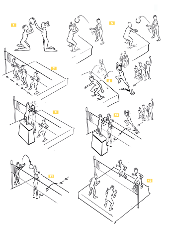 - Sprung auf den Weichboden mit Angriffsschlag gegen den gehaltenen Volleyball