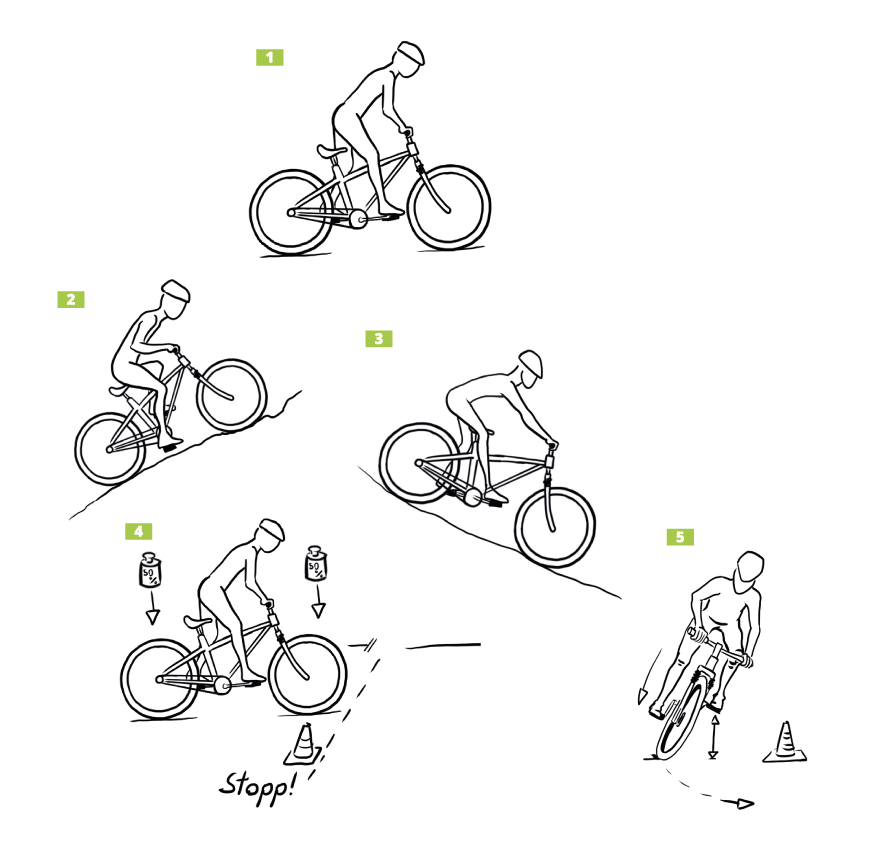 - Grundposition einnehmen mit ein bis zwei Finger am Bremshebel; gleichzeitig und dosiert beide Bremshebel bedienen; Schwerpunkt etwas nach unten und nach hinten verlagern; Gewicht möglichst gleichmäßig auf beide Räder verteilen;
