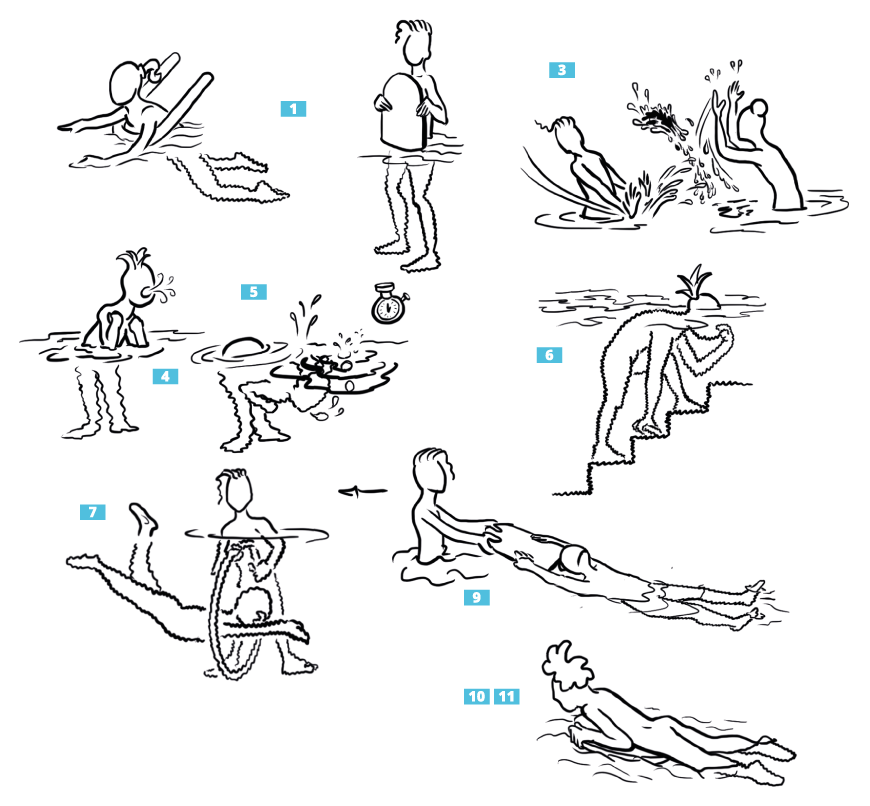 - Schüler/-innen: Kenntnis von Baderegeln, allgemeinen Gefahren und Vorsichtsmaßnahmen