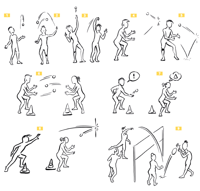 - Ball senkrecht nach oben spielen und dabei vorwärts, seitwärts und rückwärts gehen (Variante: auf optisches Zeichen der Lehrkraft)